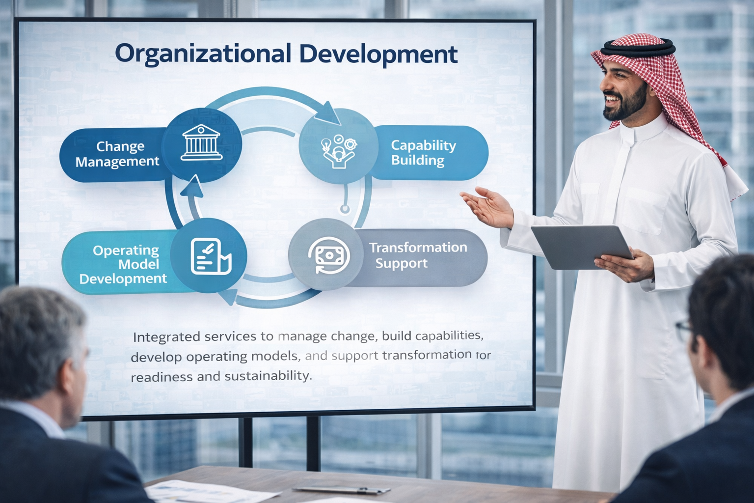 We deliver integrated organizational development services covering change management, capability building, operating model development, and transformation support to enhance readiness and sustainability