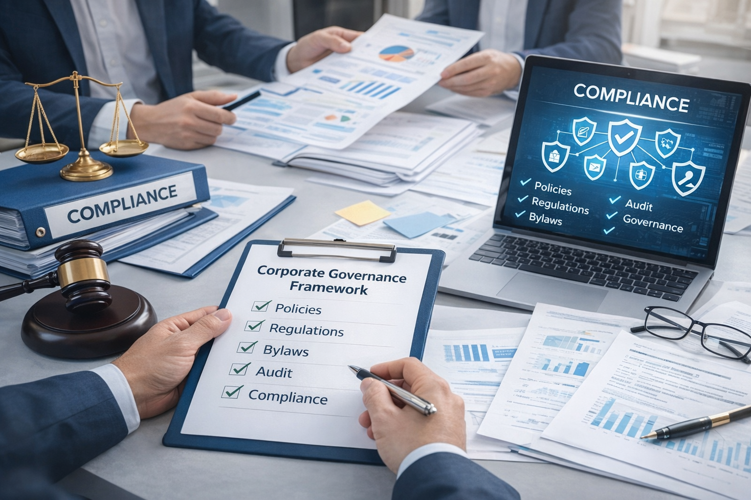 We deliver integrated governance and compliance services covering governance frameworks, policies and bylaws, organizational alignment with regulations, and internal audit support to enhance compliance and control effectiveness