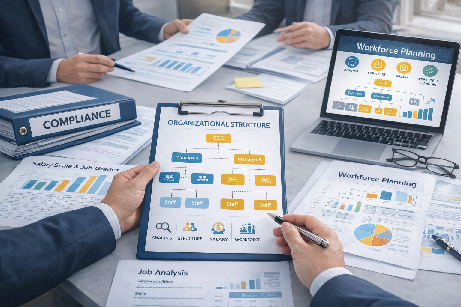 We deliver integrated HR and organizational services covering job analysis and classification, organizational structure design, salary scales, and workforce planning to align people with organizational goals and improve performance