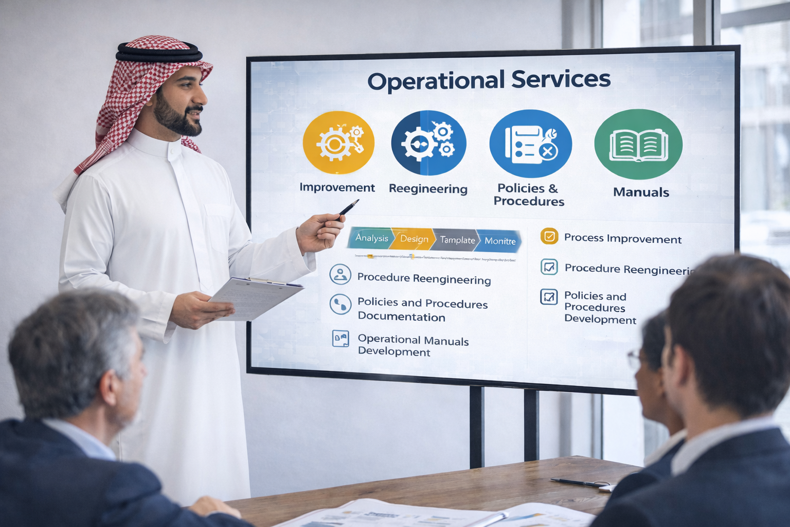 We deliver integrated operational services covering process improvement, procedure reengineering, policies and procedures documentation, and the development of operational manuals to enhance efficiency and execution quality